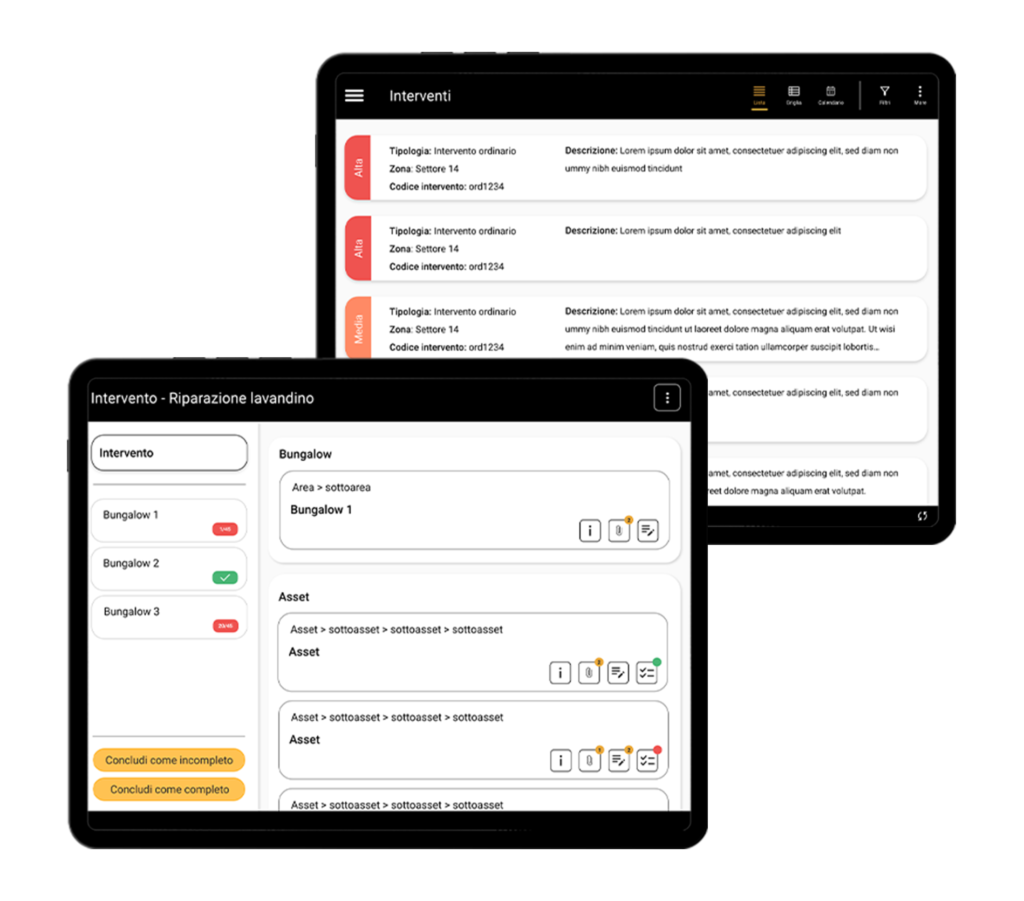 Gli interventi verranno suddivisi per priorità a seconda dell'urgenza dell'intervento. Il tecnico avrà l'elenco degli asset da riparare e potrà visualizzare le informazioni, le note e gli allegati di ognuno.